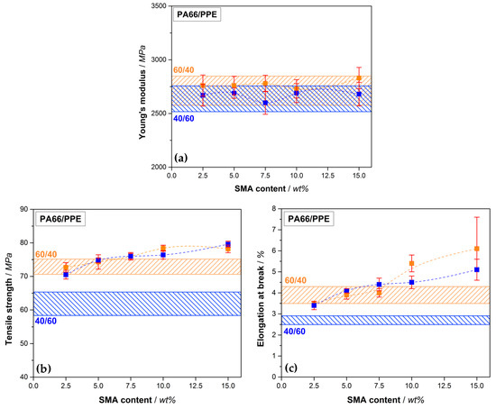 The mechanical properties of PA66/PPE/SMA blends are discussed by considering their response in a tensile test. In Figure 5, the Young’s modulus, tensile strength, and elongation at break are depicted, respectively. The corresponding values are summarized in Table A2.