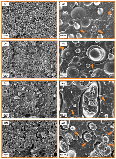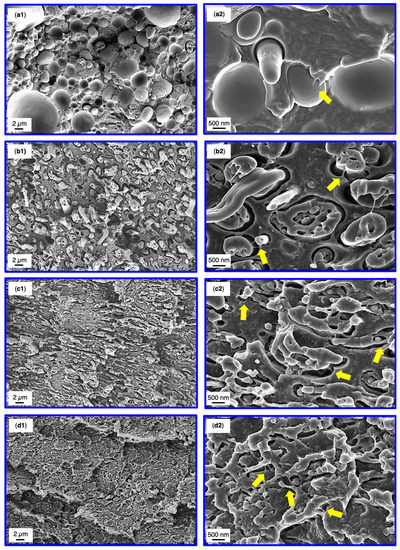 SEM analysis of the SMA compatibilized blends was conducted after tensile test to correlate the results with the corresponding fracture surfaces. The fractographs of 60/40 blends are depicted in Figure 6, whereas the 40/60 fracture surfaces are shown in Figure 7. Overview graphs with 2500× magnification are placed in the left column (Figure 6 and Figure 7(a1–d1)) together with graphs at a magnification of 15,000× for the analysis of the micromechanics (Figure 6 and Figure 7(a2–d2)).