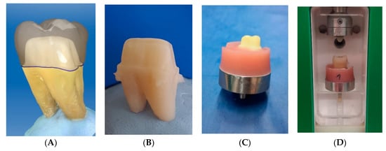 Sixteen non-carious and non-cracked mandibular molars were selected from a collection of extracted teeth of the University of Zurich (Zurich, Switzerland) and stored in 0.1% thymol solution (Sigma-Aldrich Chemie GmbH, Buchs, Switzerland) []. The patients had given informed consent for the anonymized use of their teeth and no approval from the local ethical committee (Kantonale Ethikkommission, Zurich, Switzerland) was required. The mandibular molars were mechanically cleaned of periodontal ligament remains and calculus using a scaler, and then polished with pumice stone and water using an occlubrush (KerrHawe SA, Bioggio, Switzerland). Afterwards, they were scanned with the Cerec Omnicam (Dentsply Sirona, York, PA, USA). These scan data were used to record the original tooth morphology for the design and fabrication of the crowns by applying the CAD mode “biocopy” (CEREC software SW 4.6 beta 2; Dentsply Sirona, York, PA, USA). After scanning, the mandibular molars were prepared for crowns following the guidelines for all-ceramic preparation: shoulder finishing line, total occlusal convergence of 10–20 degrees, occlusal reduction of at least 1 mm, radial reduction of at least 0.8 mm and minimal occlusocervical dimension of 4 mm []. The preparations were scanned again with the Cerec Omnicam (Dentsply Sirona, York, PA, USA) and the crowns were designed using the “biocopy” function (Figure 1A). To check the dimensions of the preparations, the parameters “minimal thickness (radial)” and “minimal thickness (occlusal)” were adjusted (radial: 800 μm; occlusal: 1000 μm). Other than that, standard design parameters for single crowns recommended by the manufacturer were used.