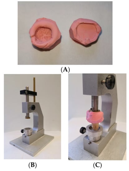 The root tips of the human teeth were ground using a grinding wheel to achieve a plane surface and allow for stable positioning. By this means, a specimen height of 14 mm was established, which was also the largest block size available for production of the CAD/CAM root replicas. The control group of 16 specimens was embedded with polymethyl methacrylate (Paladur; Kulzer GmbH, Hanau, Germany) in sandblasted metal carriers (Figure 1C). Human enamel antagonists were positioned using occlusal paper so as to meet the centric fossa of the crowns. An impression of the embedded specimen’s position and occlusal surface was made with a silicone (Optosil; Kulzer GmbH) and a self-made device, allowing for identical positioning of further specimens (Figure 2).