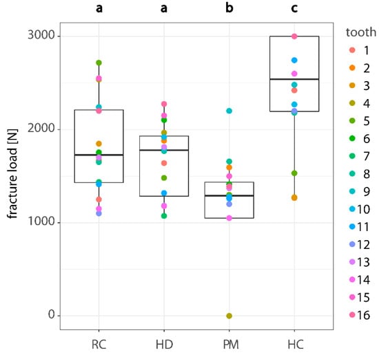 Fracture load (N) according to used abutment material. Dots of same color correspond to specimens with same morphology. Different lowercase letters indicate statistically significant difference of estimated means among abutment materials RC, HD, PM and HC. Medians were 2540 N for HC, 1778 N for HD, 1728 N for RC and 1290 N for PM. RC, reinforced composite; HD, human dentin; PM, polymethyl methacrylate; HC, hybrid ceramic.