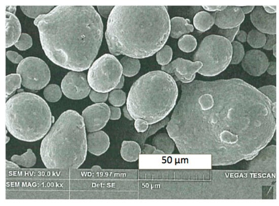 Density of bulk material 1.2709 is ρ ≈ 8.0–8.1 g/cm3. The initial material was powdered down to 43 μm particle diameter as a 90% prevailing fraction seen in scanning electron microscope (SEM) image in Figure 3.