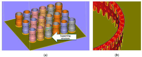 Figure 4. Arrangement of the samples in the 3D printer space: (a) overview; (b) example of supportive structure.