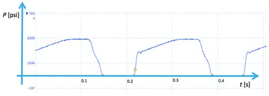 The experimental rig was built for the high pressure pulse load tests. The maximal pressure load obtainable in the test rig was 5000 psi (35 MPa), and the safety system stops the procedure when the sample is destroyed. The latter is indicated by the presence of oil outside the tested sleeve in the sink unit. During the work, the system generates pressure P pulses with period of ca. 0.2 s. The pressure transducer connected with oscilloscope enables to check the parameter of the pressure pulses. Example of the pressure indications registered by the oscilloscope is shown in Figure 7.