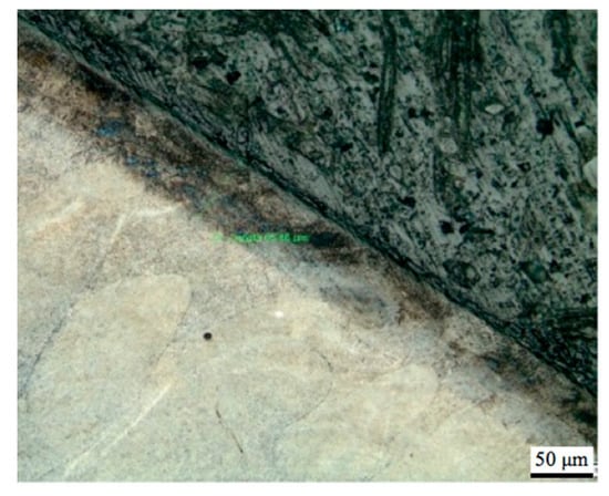 Figure 10a–c presents examples of SEM image of the structures obtained in the sample that belonged to the respective groups 1, 2 and 3. In case of group 3, the surface layer modified by TENIFER process is clearly distinguishable in Figure 10c. In order to emphasize the modified layer, the samples were etched with nital, an example of the photomicrograph is shown in Figure 11.
