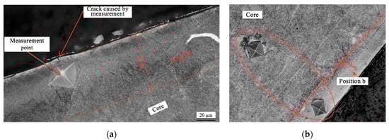 Figure 12. Photomicrograph of the microhardness measurement: (a) sample 1 with the measurement point a; (b) sample 2 with the measurement point b.