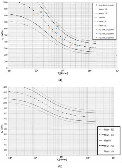 Figure 14. S-N logarithmic plot of hoop stress for fatigue strength of the tested sleeves, material 1.2709 with different porosity: (a) 0.4–0.6%; (b) 0.05–0.1%.