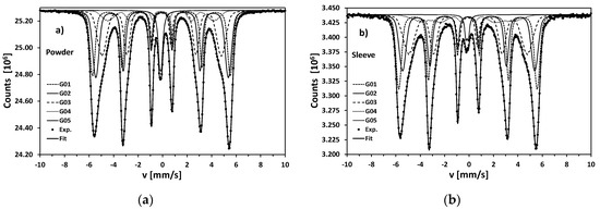 Mössbauer spectrometry, as a very common technique in the case of various kinds of steels [20,29,30,31,32], has been utilized in order to determine iron-bearing phases. Transmission Mössbauer spectra (TMS) collected at room temperature are presented in Figure 15a,b for the initial powder and 3D printed sleeve, respectively. The spectra were fitted with a set of 5 Voigt-like sextets. G01-G04 components were utilized in order to describe the smeared sub spectrum very characteristic for martensite in maraging steel [29,30].