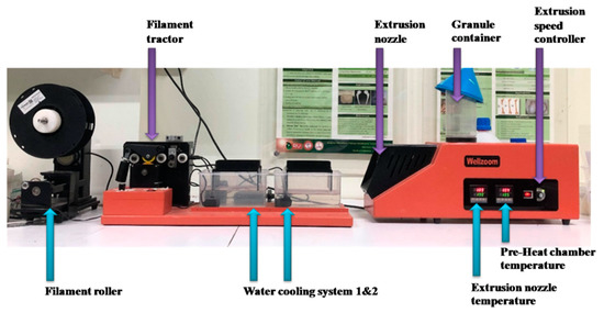 Extrusion conditions of both filaments for B-BBBS and AC-BBBS layers were set up similarly. The temperature of the pre-heat chamber was set at 190 °C, while the extrusion nozzle was set in the range of 190–200 °C. After turning the temperature on, the materials were kept in the pre-heat chamber for 15 min before being supplied to the heated nozzle. The first run of the filament was manually tracked to the water-cooling system until the starting tip of the filament reached the filament tractor. Then, the extrusion speed and tractor speed were adjusted until the extruded filament diameter was 1.75 ± 0.05 mm and running smoothly. The filament, produced in the suitable conditions, was rolled to the filament spool using a filament roller, which adjusted the rolling speed related to the filament tractor speed. The diameters of the extruded filaments were measured and the extrusion parameters were adjusted until the extruder provided a constant diameter (1.75 ± 0.05 mm) [77,78]. Then, the filaments were randomly measured during the extrusion. The extruded filaments were randomly selected at 2 m lengths. The diameters of the 2 m selected filaments were measured and recorded every 20 cm.