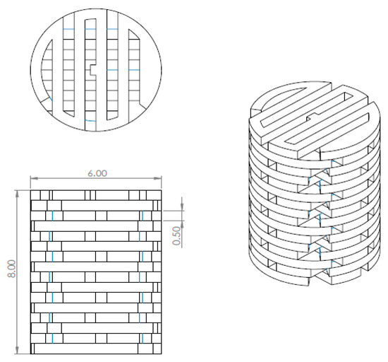The scaffold was printed using the core XY FFF 3D printer. The single platform was designed to print continuously and be connected to the next platform. Every single platform was rotated 90° against the lower platform. Each platform was 0.5 mm in height and a printed set contained four single platforms. The PLA/PCL/15HA was printed for three sets and the PLA/PCL was printed for the last set. The total height of the 3D-printed structure was 8 mm with a 6 mm diameter, as shown in Figure 5. The nozzle size of the printer was 0.4 mm. The printing conditions consisted of a 0.2 mm printed layer height, and a nozzle melting temperature of 200 °C.