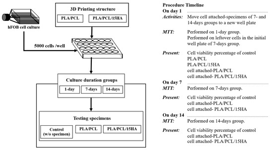 On day 1, the MTT assay was performed on the 1-day group, consisting of the control, PLA/PCL, and PLA/PCL/15HA. The control represented the only cell culture without the testing specimen. The PLA/PCL represented the cell culture with the 3D-printed PLA/PCL specimen. The PLA/PCL/15HA represented the cell culture with the B-BBBS layer specimen. According to the morphology of our scaffold, the seeded cells had fallen as a result of gravity, passing through the porous cavities to the bottom of the well plate. Therefore, cells were attached on each layer of specimen and on the well plate. To only investigate cells attached on the specimens, the PLA/PCL and PLA/PCL/15HA specimens of the 7- and 14-day groups were moved from the initial well plate to a new well plate. Thus, only cells attached on the specimen were continuously cultured in the new well plate until day 7 and 14. The leftover cells in the initial well plate of the 7-day group (on day 1) were selected to perform the MTT assay and the cell viability percentages of this leftover cells were used to calculate and estimate the percentage of cells attached on the specimen of the 1-day group. Therefore, the cell viability percentages on day 1 were presented in five groups consisting of the control, PLA/PCL, PLA/PCL/15HA, cells attached on the PLA/PCL specimens (cell attached-PLA/PCL), and cells attached on the PLA/PCL + CS/SF specimens (cell attached-PLA/PCL/15HA) groups.