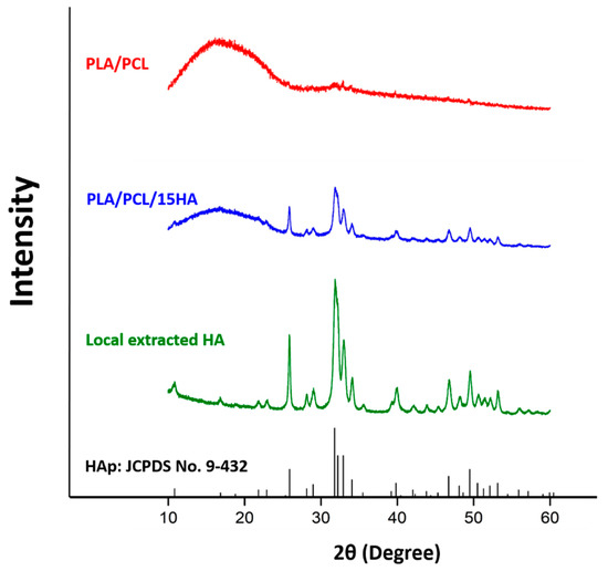X-ray diffraction (XRD) patterns of polylactic acid (PLA)/polycaprolactone (PCL), PLA/PCL/15HA, and local extracted HA show that the local extracted HA and its presence in PLA/PCL/15HA are correspond to the characteristic peak of hydroxyapatite (HAp) (Joint Committee on Powder Diffraction Standards file number (JCPDS) No. 9-432).