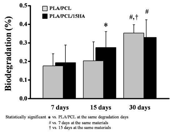 The biodegradation test was performed on the cubic printed specimens, as shown in Figure 11. The weight difference of the specimens was calculated and presented in biodegradation percentage, as shown in Figure 12. After soaking the specimens in PBS solution containing lysozyme for 7, 15, and 30 days, the biodegradation percentage was obtained after comparing the collected data according to degradation days with the data of the starting point. The degradation percentages are presented as mean ± SD. The comparison between the degradation days of the same material compositions presented a slight increase in the biodegradation percentage, related to the increasing number of degradation days. However, a statistical difference was seen on day 30 for both groups. On day 30, PLA/PCL presented the highest degradation percentage (0.35 ± 0.05%), by a significant amount, as compared with the same group on days 7 and 15. Furthermore, the PLA/PCL/15HA groups presented the highest degradation percentage (0.33 ± 0.09%) on day 30, significantly higher than day 7 only. When comparing between the PLA/PCL and PLA/PCL/15HA groups on day 15, the biodegradation percentage of PLA/PCL/15HA (0.27 ± 0.09%) was significantly higher than that of PLA/PCL (0.2 ± 0.1%). The dimensions of the specimens were also investigated, but there was no change in the dimensions after 30 days of degradation.