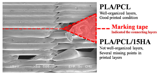 The structure and size of BBBS were designed based on the requirements of the consultant orthopedic surgeons (Department of Orthopedics, Faculty of Medicine, Chiang Mai University, Chiang Mai, Thailand). The difference between PLA/PCL and PLA/PCL/15HA layers was not easily distinguishable because of the same color of the raw material granules. However, it can be seen at certain tilted angles. The different morphology of the printed structure between PLA/PCL and PLA/PCL/15HA filaments was observed using SEM. Masking tape was placed to indicate the connecting layer between PLA/PCL and PLA/PCL/15HA, as shown in Figure 14. The layer of PLA/PCL was better organized than the PLA/PCL/15HA printed layer using the same printing conditions.