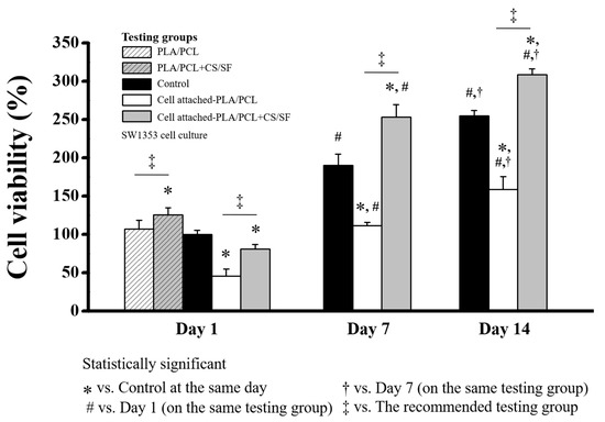 On day 7 and day 14, the MTT assays were performed and the cell viability percentages were presented in three groups consisting of the control, cell attached-PLA/PCL, and cell attached-PLA/PCL + CS/SF groups, as shown in Figure 6.