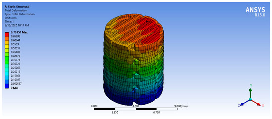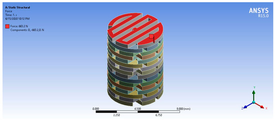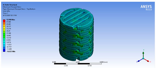 For finite element analysis (FEA), the mechanical properties were obtained from the mechanical tests. The simulating software ANSYS R15.0 Workbench (ANSYS, Inc., Canonsburg, PA, USA) was used to analyze the maximum load that the designed structure could carry. The base of the model was fixed, and the distributed compression load was applied to the surface of the model. The applied load was randomly applied until the maximum principle stress of the model reached the minimum mechanical strength of the 3D-printed materials. The AC-BBBS thickness for FEA was 2 mm, which was selected from the normal thickness of the AC at the femoral condyles (approximately 1.65 to 2.65 mm) [85]. The mechanical properties of PLA/PCL were applied to the AC-BBBS layer. Meanwhile, the mechanical properties of PLA/PCL/15HA were applied to another 6 mm of the structure (the B-BBBS layer) for the FEA.