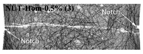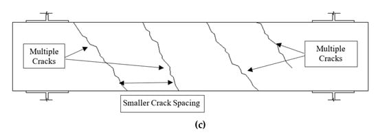 41]. Cracks tend to propagate through the path of least resistance in the fibre–matrix, particularly with fibres added at low volume fraction. According to