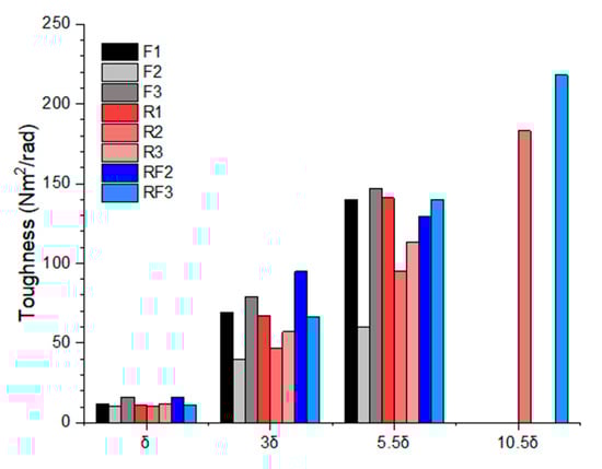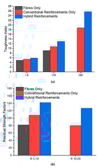 Figure 10 were used as a baseline for the comparison between the fibres only beams and hybrid reinforcements beams. Referring to the residual toughness factors of conventional reinforcements, it can be seen that there was slight hardening observed for