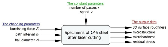 The tests were conducted using 5 mm × 8 mm × 100 mm specimens of non-alloy C45 steel (Rm = 740 MPa, Re= 430 MPa, hardness = 250 HB). Steel of this grade is successfully used in the production of medium-load machine and equipment parts, such as spindles, shafts, axles, and unhardened gears. The specimens used in the experiment were cut with a LASER Amada 3000 W laser cutter from Amada America Inc. (Haan, Germany) set to the following technological cutting parameters: cutting speed v = 1150 mm/min, power: 2.15 kW, frequency fHz = 1280 Hz, assist gas pressure 0.06 MPa, laser beam focus position +13 mm. Oxygen was used as the assist gas. Figure 1 shows the experimental design, which includes a set of variable, constant and output (indirect) factors.