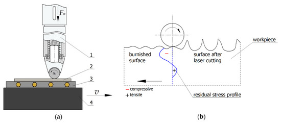 In the experiments, laser-cut surfaces were finished by ball burnishing (Figure 2). During burnishing, a ball-shaped burnishing tool rolls without slipping against the surface being processed, deforming the asperity summits produced in the pre-machining operation (Figure 2b). Ball burnishing is used to smooth and harden the surface, reduce shape defects, carve lubrication microgrooves and increase fatigue strength. In some cases, ball burnishing can replace grinding and lapping operations.