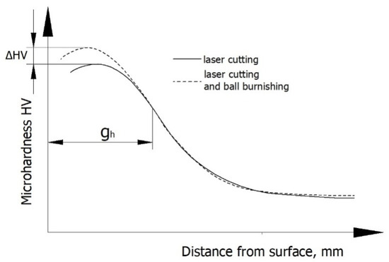 Microhardness distribution of C45 steel element surface layer after laser cutting and laser cutting and ball burnishing (Fn = 720 N, fw = 0.17 mm, dn = 8 mm).