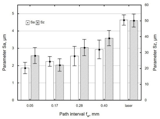 The effect of path interval fw on the roughness parameter Sa and Sz specimens after laser cutting and ball burnishing (Fn= 720 N, dn = 8 mm).