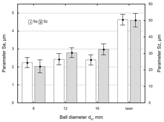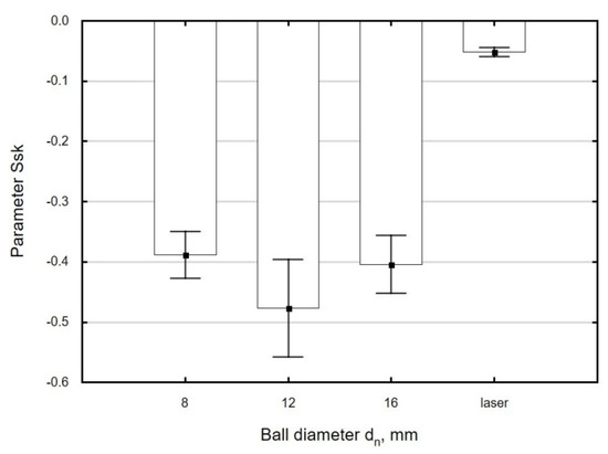 The use of variable ball diameters dn leads to small changes in Ssk as a function of this parameter, which fall within the range of standard deviation (Figure 13). The absolute values of Ssk of ball-burnished surfaces are several times higher than the values obtained for laser-cut parts, which is suggestive of an increase in the “functionality” of the processed surface. A surface with a negative skewness shows a greater capacity to transfer contact loads and a lower tribological wear in the presence of a lubricant [46].