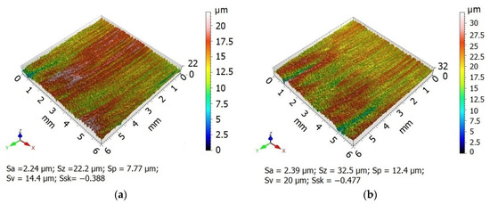 Three-dimensional topography measurements were performed using a Hommel-Etamic T8000RC 120–140 mechanical roughness tester (Jenoptik, Villingen-Schwenningen, Germany). The scanned area was 6 mm × 6 mm. The TKU300 measuring tip travelled along measuring paths which were perpendicular to the traces of the asperities produced by machining. Hommel Map Basic software(Version 6.2, Jenoptik, Villingen-Schwenningen, Germany) was used to determine 3D surface roughness parameters.