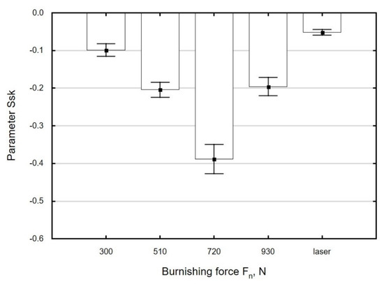 Ball burnishing of laser-cut surfaces increased the absolute value of skewness from 90% to 820% in relation to the value obtained after laser cutting. In [14], the absolute value of Ssk was increased from 48% to 268% during the ball burnishing of milled X38CrMoV5-1 martensitic steel.