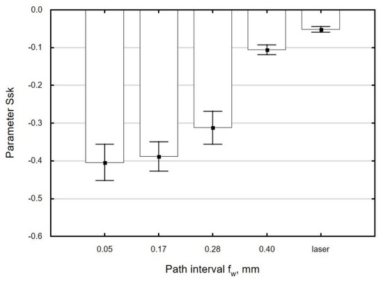 At path intervals in the range fw = 0.05–0.28 mm, only very small changes in the value of Ssk were observed (Figure 12). When the path interval was greater than fw = 0.28 mm, there was no significant increase in the absolute value of Ssk in relation to the value observed for laser-cut parts. This can be explained by the fact that at large path intervals, the asperity summits do not undergo complete deformation. As a result, the surface of the processed material features spots that have not been burnished.
