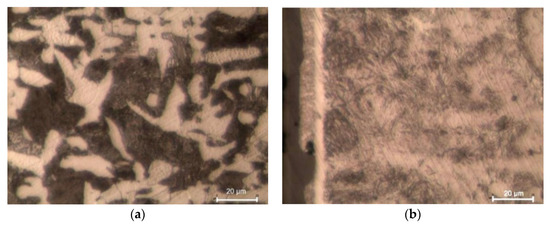 During laser cutting, the material being cut is strongly heated and then cooled down, which leads to the hardening of the material around the cut edge. The original ferrite-pearlite structure of C45 steel (Figure 14a) undergoes changes. The HAZ that forms around the cut edge has a different structure from the raw material. Martensite needles as well as ferrite and martensite are visible in the HAZ just next to the edge (Figure 14b). The laser cutting process was too short-lasting for ferrite grains to become enriched with carbon, which led to the formation of low-carbon martensite. Perlite, on the other hand, changed into high-carbon martensite.