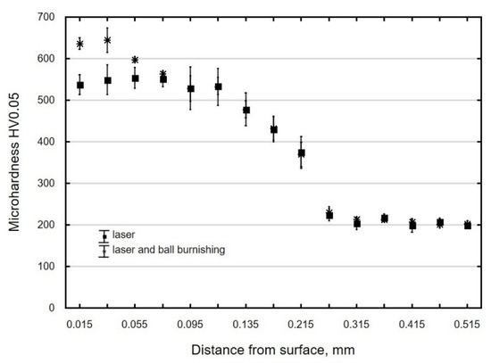 In laser-cut specimens, the zone in which changes in microhardness occur is 0.3 mm wide (Figure 15). The microhardness increase ΔHV in the area of the cut edge is about 330 HV0.05, and it decreases away from the edge and deeper into the material, to reach core microhardness (Figure 15). Though the hardness and the thickness of the hardened layer increase only slightly as a result of ball burnishing (Figure 15), the increase is likely to translate into enhanced resistance to abrasive wear [22].