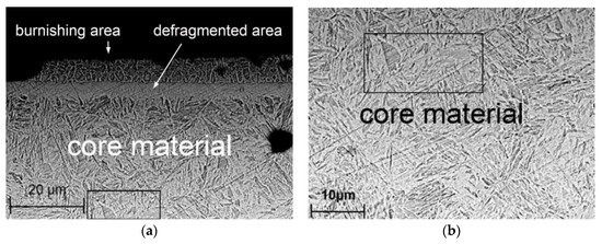 The ball-burnished surface layer constitutes a collection of plastically deformed crystals. This means that ball burnishing leads to structural changes and changes in the hardness of the material. Figure 16a shows the microstructure of laser-cut-and-ball-burnished material. In the edge zone with an HV 0.01 microhardness of 731.4 HV (Figure 16b), the martensite laths were broken up into smaller elements (fragmentation). As the tool comes in contact with the workpiece, phenomena occur that contribute to the defragmentation of the edge zone.