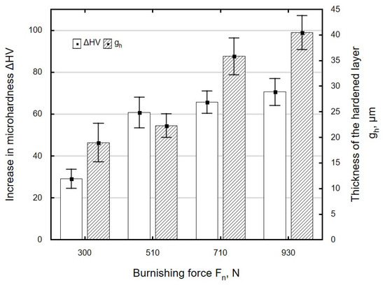 The hardness increase ΔHV and the thickness of the hardened layer gh depend on technological parameters. An increase in burnishing force Fn leads to an increase in cold-work energy, which, when accumulated, causes an increase in the hardness of the areas close to the surface of the workpiece (Figure 17). The greatest microhardness increase was obtained when the burnishing force increased in the range from 300 to 510 N. At burnishing forces greater than Fn = 510 N, the effect of this parameter on microhardness increase clearly decreased, which was associated with the occurrence of the state of saturation. The hardened layer was from 19 to 40 µm thick and its thickness increased with the increase in burnishing force, with the reservation that for forces in the range of 720–930 N, the increase in microhardness and thickness of the hardened layer was small.
