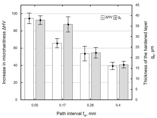 Influence of path interval fw on microhardness increase ΔHV and thickness of the hardened layer gh of specimens after laser cutting and ball burnishing (Fn = 720 N, dn = 8 mm).