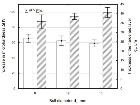 Figure 19 shows the effect of ball diameter dn on the microhardness increase ΔHV and the thickness of the hardened layer gh. A maximum microhardness increase was obtained for the ball with the diameter dn = 8 mm, and the largest thickness of the hardened layer was for the ball with the diameter dn = 16 mm. For the investigated ball diameter range, changes in ΔHV and gh were small and fell within the range of standard deviation. Changes in ΔHV and thickness gh are associated with an increase in the radius of curvature of the ball, which increases with dn.