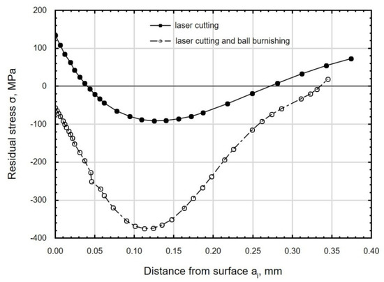 The use of ball burnishing as a finishing treatment for laser-cut parts led to the formation of compressive residual stresses in the surface layer of the workpiece. Grinding, which has so far been used as a standard procedure for finishing laser-cut parts, generates tensile stresses in the surface layer of the material [44]. The maximum values of compressive residual stress σmax obtained in the present experiments were lower than those obtained by centrifugal shot peening, for which |σmax| = 448–737 MPa; however, the depth of compressive residual stresses was similar to that obtained in centrifugal shot peening tests [42].