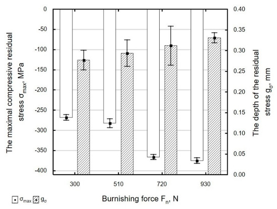 An increase in burnishing force Fn caused an increase in the absolute value of compressive residual stress (Figure 21); the largest changes in residual stress were observed for forces in the range of Fn = 510–720 N. When the ball was pressed against the workpiece with a greater force during a pass, the deeper-lying deformed zones elastically compressed the areas lying closer to the surface. The burnishing force had a smaller effect on the depth of accumulation of compressive residual stresses that lie at depths of 0.28–0.33 mm. The highest compressive stresses and the largest depth of accumulation of compressive residual stresses were obtained for Fn = 930 N.