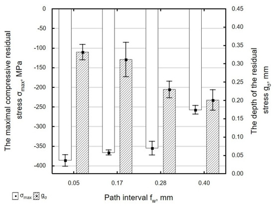 Influence of path interval fw on the value of maximal residual stress σmax and the depth of the accumulation compressive residual stress gσ of laser cut and ball burnishing specimens (Fn = 720 N, dn = 8 mm).