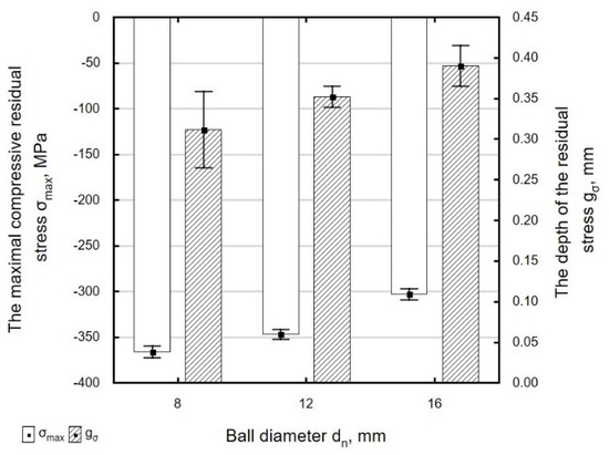 As the diameter of the ball increases, the absolute value of maximum residual stresses σmax decreases, which can be explained by the increase in the radius of curvature of the ball and a decrease in pressure per unit area. At the same time, the depth of penetration of compressive residual stresses gσ increases (Figure 23). When the 16 mm diameter ball was used, the depth of penetration of compressive residual stresses was 20% greater and the value of those stresses was 17% smaller than for the dn = 8 mm ball.
