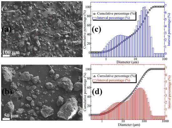 (a) SEM image of MgO particles; (b) SEM image of FD particles; (c) particle size distribution of MgO powder; (d) particle size distribution of FD powder.
