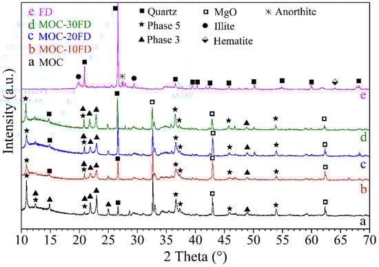Figure 2 shows the XRD spectra of FD powders, pure MOC paste, and MOC paste with different FD content. It can be observed that Phase 5 [5Mg(OH)2·MgCl2·8H2O], Phase 3 [3Mg(OH)2·MgCl2·8H2O], periclase, and quartz exist in the pure MOC paste. The formation of Phase 5 and Phase 3 could be described by the following chemical reactions: