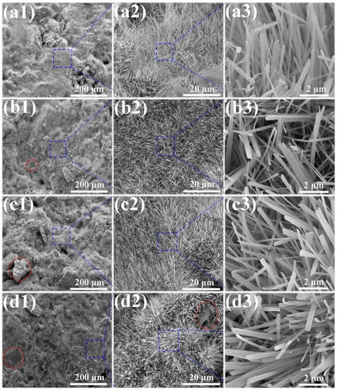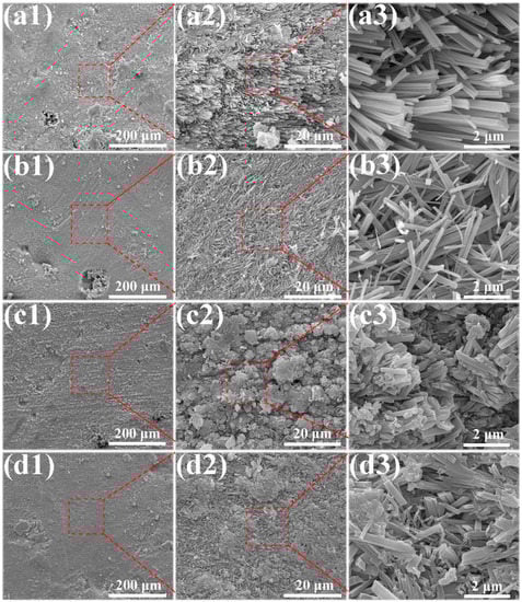 SEM morphologies of the as-prepared surfaces of different samples. (a1), (a2) and (a3) pure MOC; (b1), (b2) and (b3) MOC-10FD; (c1), (c2) and (c3) MOC-20FD; (d1), (d2) and (d3) MOC-30FD.