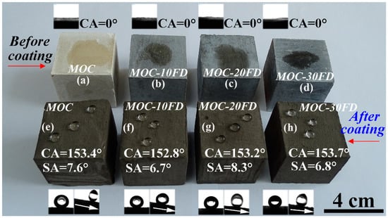 Superhydrophobic coating may be an effective method to improve the water resistance of MOC [16]. The surface contact angle (CA) of the superhydrophobic material is greater than 150° and the sliding angle (SA) is less than 10° [17,18,19]. When a superhydrophobic material is in contact with water, a trapped air layer exists in the interface layer between solid and liquid to separate the solid and liquid phases. Therefore, the actual contact area between superhydrophobic materials and water is very small [20]. These materials have excellent hydrophobicity and can effectively protect materials from water erosion. Silane/siloxane surface impregnant can effectively improve the impermeability of PC-based materials and reduce its water absorption [21,22,23]. However, because the hydration products of MOC and PC are completely different, silane/siloxane modifier is not applicable in the field of MOC. In our preliminary experiment, we found that the silane/siloxane-based surface modification method was ineffective for MOC. Very recently, Qu et al. prepared fluoroalkyl silane (FAS)-based superhydrophobic coating on MOC surface. However, the water resistance of the FAS-based superhydrophobic coating was not investigated [3].