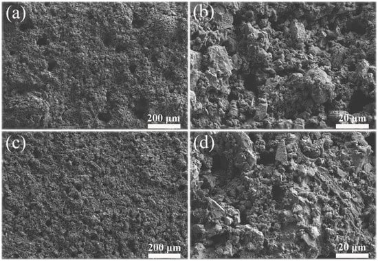 FE-SEM images of two kinds of PC coatings: (a) and (b) PC coatings without using hydrophobic emulsion; (c) and (d) PC coating containing hydrophobic emulsion.