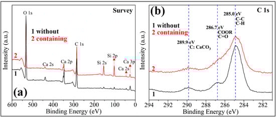 XPS spectra of two kinds of PC coatings (without using hydrophobic emulsion and containing hydrophobic emulsion): (a) survey spectra; (b) high resolution spectra in C 1s region.