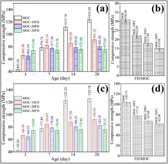 The softening coefficient test is conducted with reference to standard [ISO 679:1989]. The FD/MOC containing different FD contents were stored at room temperature for 28 days, and the softening coefficient was tested according to the following equation: