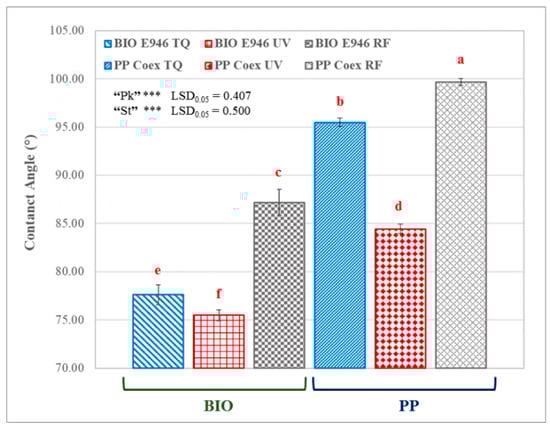 Effect of packaging film and sterilization treatment on contact angle. TQ = original sample, UV = UV treated film; and radiofrequency (RF) = RF treated sample. Different red letters above bars indicate significant differences at p < 0.05 (LSD test). *** Main effects significant at p ≤ 0.001. Error bars are also reported.