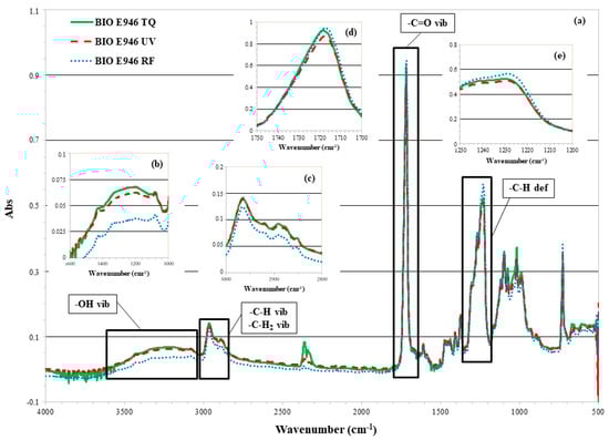 ATR-FTIR spectra of (a) BIO E946, before (TQ) and after UV and RF treatments; expansions in the regions (b) 3600–3000 cm−1, (c) 3000–2800 cm−1, (d) 1750–1700 cm−1 and (e) 1250–1200 cm−1.