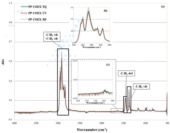 ATR-FTIR spectra of (a) PP Coex, before (TQ) and after UV and RF treatments; expansions in the regions (b) 3000-2800 cm−1 and (c) 1800-1600 cm−1.